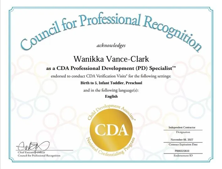 As a CDA Professional Development (PD) Specialist π©π½βπ«, I am honored to support early childhood professionals on their journey to earning the Child Development Associate (CDA) Credential π. I am officially endorsed by the Council for Professional Recognition π to conduct CDA Verification Visits for Infant πΆπ½, Toddler π§π½, Birth to 5 π©βπ§, and Preschool π¨ candidates in English.